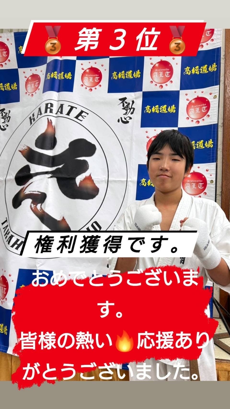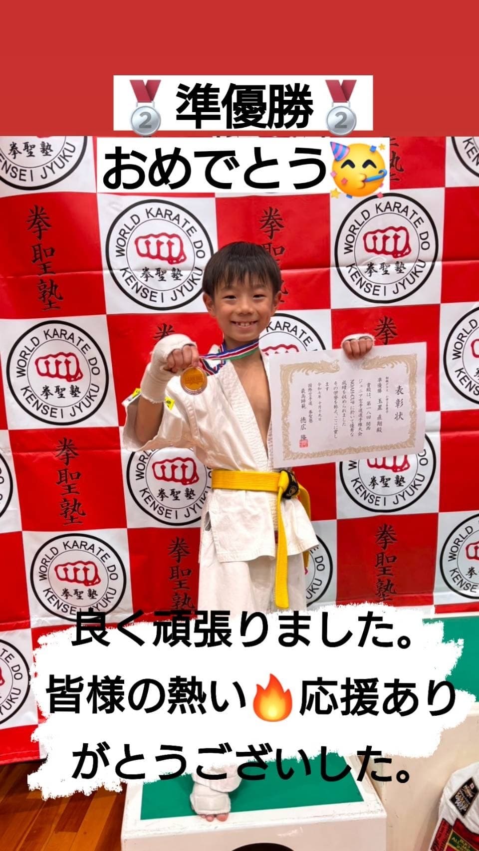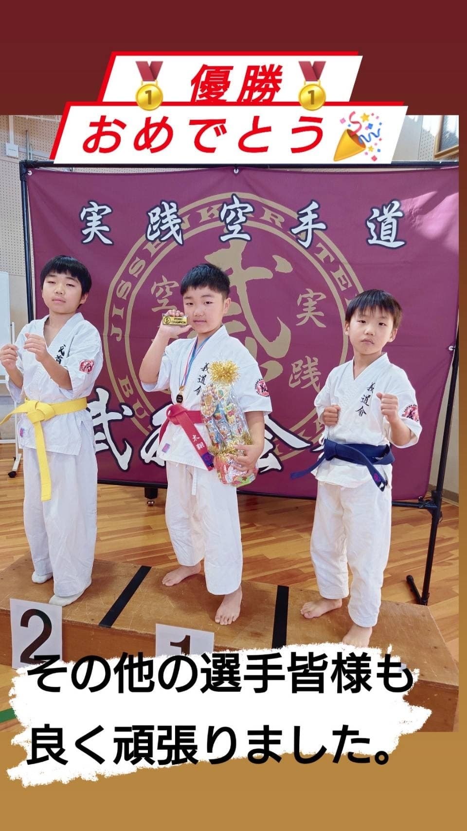 2025年 大会結果2024年 大会結果2023年 大会結果2022年 大会結果2021年 2025年1月26日(日)第4回全日本空手道ジュニア新人育成選手権大阪大会(真門塾主催) 坊之本寛悠 優勝 中学1年男子 坊之本悠聖 準優勝小学3年男子 千代原碧海 優勝小学2年男子 山崎太翔 準優勝小学1年男子 小川慶太 第3位小学6年男子 2025年2月23日(日)第6回オープントーナメント世界全極真近畿選抜大会(国際空手道連盟極真会館 世界全極真兵庫県米山道場主催) 玉置隼 第3位小学5年男子上級 第13回チャンピオンシップ出場権を獲得しました! 2025年3月15日(土)2024年度全日本ランキングファイナル(全日本ランキング委員会主催) 玉置隼 第3位小学5年男子上級 玉置直翔 ベスト8小学1年男子初級 2025年3月16日(日)第16回オープントーナメント極真サムライ杯四国春の陣(極真会館長谷川道場主催) 玉置隼 第3位 小学5年男子選抜 2025年5月11日(日)第7回滋賀びわこ魂杯空手道選手権大会(昇心塾主催) 玉置隼 ベスト8 小学6年男子上級 玉置直翔 準優勝小学2年男子初級第3回IBKA ALL JAPAN CHALLENGE CUPの出場権を獲得しました! 2025年5月25日(日)第15回極真会館難波宮杯空手道選手権大会(極真会館柳生道場主催) 吉田悠人 優勝 一般男子有段 2025年6月8日(日)第10回ガチンコカップ2025オープントーナメント烈士塾空手道選手権大会(烈士塾主催) 坊之本寛悠 優勝 中学2・3年男子中級 坊之本悠聖 第3位小学4年男子中級 2025年6月15日(日)第24回全日本空手道ジュニア新人育成選手権大会(真門塾主催) 坊之本寛悠 優勝 中学2年男子ミドルファースト 坊之本悠聖 優勝小学4年男子チャレンジセカンド 千代原碧海 優勝小学3年男子チャレンジセカンド 2025年7月6日(日)第8回オープントーナメント タフネスカップ空手道選手権大会(正道会館青雲会主催) 玉置隼 第3位 小学6年男子軽量チャンピオンクラス Adidas KARATE GRAND PRIX2025の出場権利獲得しました! 2025年7月27日(日)武神KARATE ALL JAPAN CUP 2025(武神主催) 玉置直翔 第3位 小学2年男子初級 2025年8月3日(日)第9回兵庫県空手道選手権大会(極真会館西岡道場主催) 山崎太翔 優勝 小学2年男チャレンジファースト 2025年8月11日(日)JKJO全関西空手道選手権大会2025(金森道場主催) 柴田大夢 優勝 高校男子70kg未満 2025年8月17日(日)第12回オープントーナメント世界全極真近畿大会第16,回オープントーナメント世界全極真兵庫カップ(世界全極真兵庫県米山道場主催) 玉置隼 第四位小学6年男子上級42kg未満 玉置直翔 準優勝小学2年男子中級 坊之本悠聖 第三位小学4年男子初級32kg未満 2025年8月31日(日)第25回全日本空手道ジュニア新人育成選手権大会(拳武会館主催) 坊之本寛悠 優勝中学2年男子ミドルセカンド 堀古悠真 第三位小学5年男子ミドルファースト 山崎太翔 準優勝小学2年男子チャレンジファースト 藤原凪生 準優勝小学2年男子ゼロルーキー 佐桑依知 第三位ゼロルーキー 2025年10月5日(日)第9回兵庫県空手道選手権大会第14回極真神戸大会(極真会館西岡道場主催) 玉置隼 優勝小学6年男子軽量選抜ファイナルカップ出場権を獲得しました! 坊之本悠聖 準優勝小学4年男子中級 2025年10月19日(日)第18回関西ジュニア空手道選手権大会NOAH-CUP(拳聖塾主催) 玉置直翔 準優勝小学2年男子初級 2025年11月9日(日)不動心杯空手道選手権大会(髙橋道場主催) 坊之本寛悠 第3位中学2・3年男子上級 2025年11月24日(日)第3回オープン交流杯(武秋会館主催) 山崎太翔 優勝小学2年男子